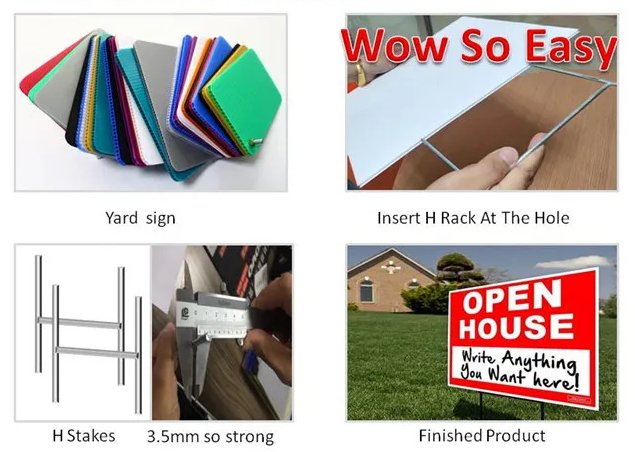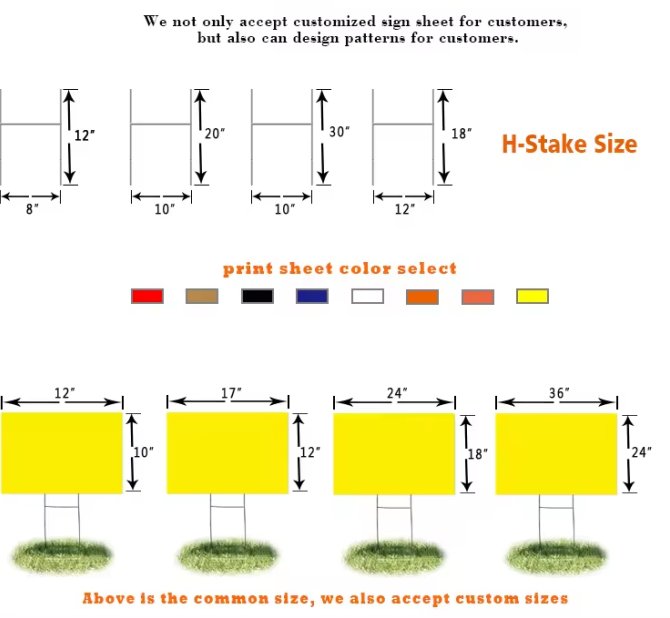 Coroplast サインは丈夫で防水性があり、非常に扱いやすいです。頑丈な構造はフォームやポスターボードよりも耐久性があり、庭の看板、展示会、不動産の展示など、屋外だけでなく屋内でも使用できます。ワイヤー杭、グロメット、両面フォームテープなど、さまざまなサイズと用途があります。安価で軽量な波形プラスチック構造。高品質のフルカラー UV 印刷。